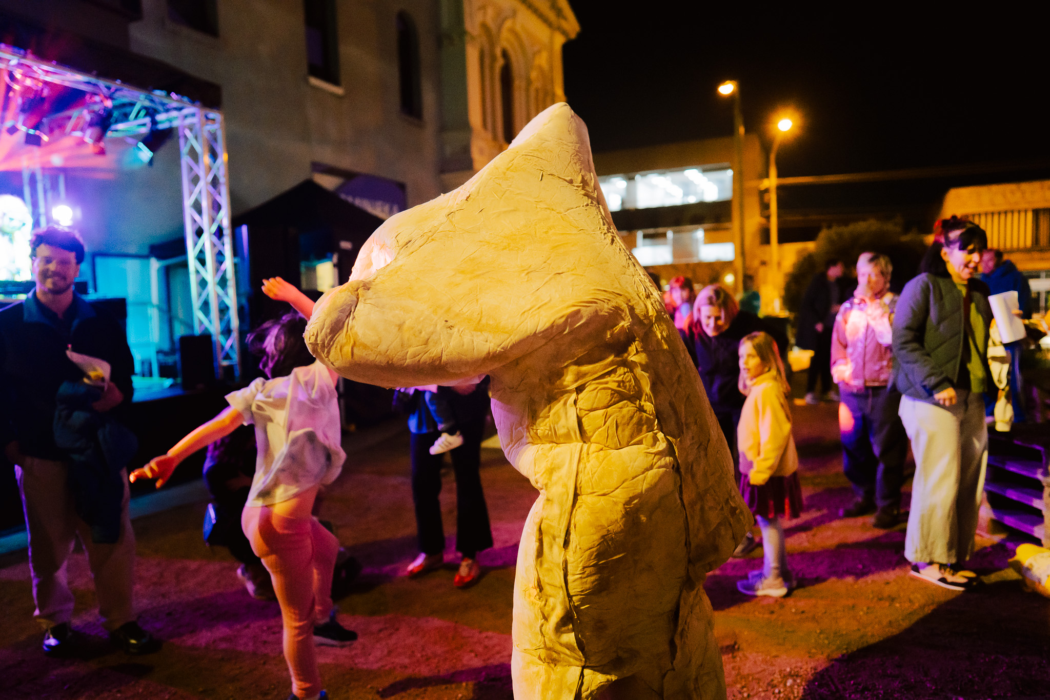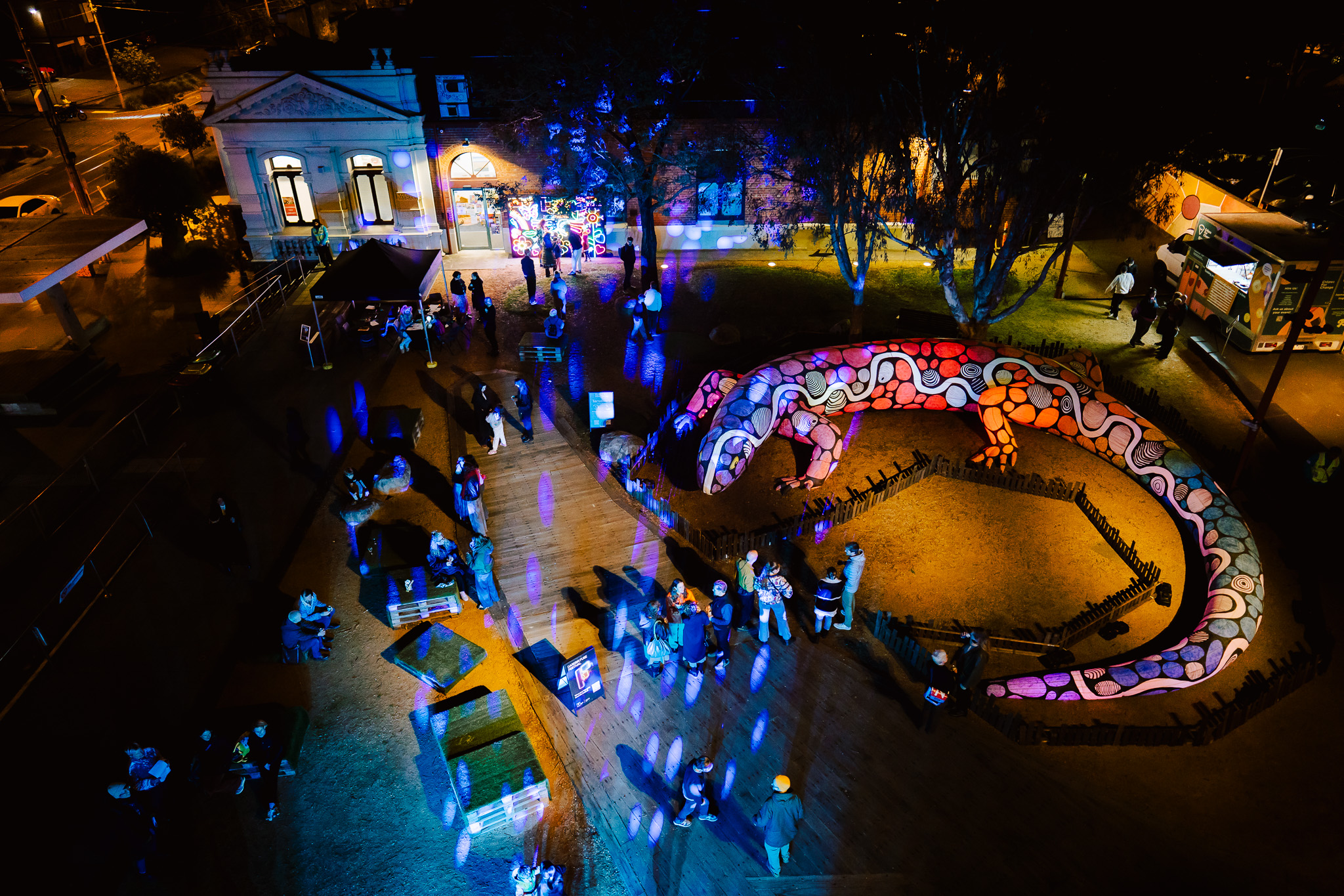 FUSE Festival @ Northcote Town Hall: Take a seat at Civic Square and experience Tarutharu – The Kaurna Skink, a 27-metre luminous skink created by Elizabeth Close Arts (Pitjantjatjara and Yankunytjatjara) and Jack Buckskin (Kaurna and Nurungga), as a representative of the Kaurna Peoples, in collaboration with Darebin-based puppet company A Blanck Canvas.